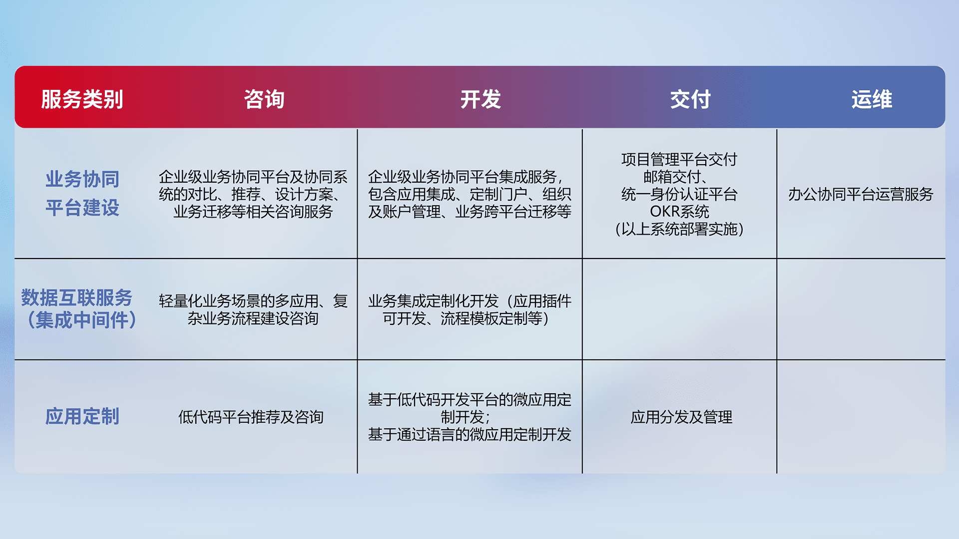 针对钉钉、、、、企微、、、IDaas等平台级产品提供产品的规划、、方案、、、、交付、、、、定制化开发等服务,,,实现如统一协同办公、、智能客户服务、、、混合会议管理、、、智能数据查询、、、等业务场景,,,,实现数字化转型。。。。