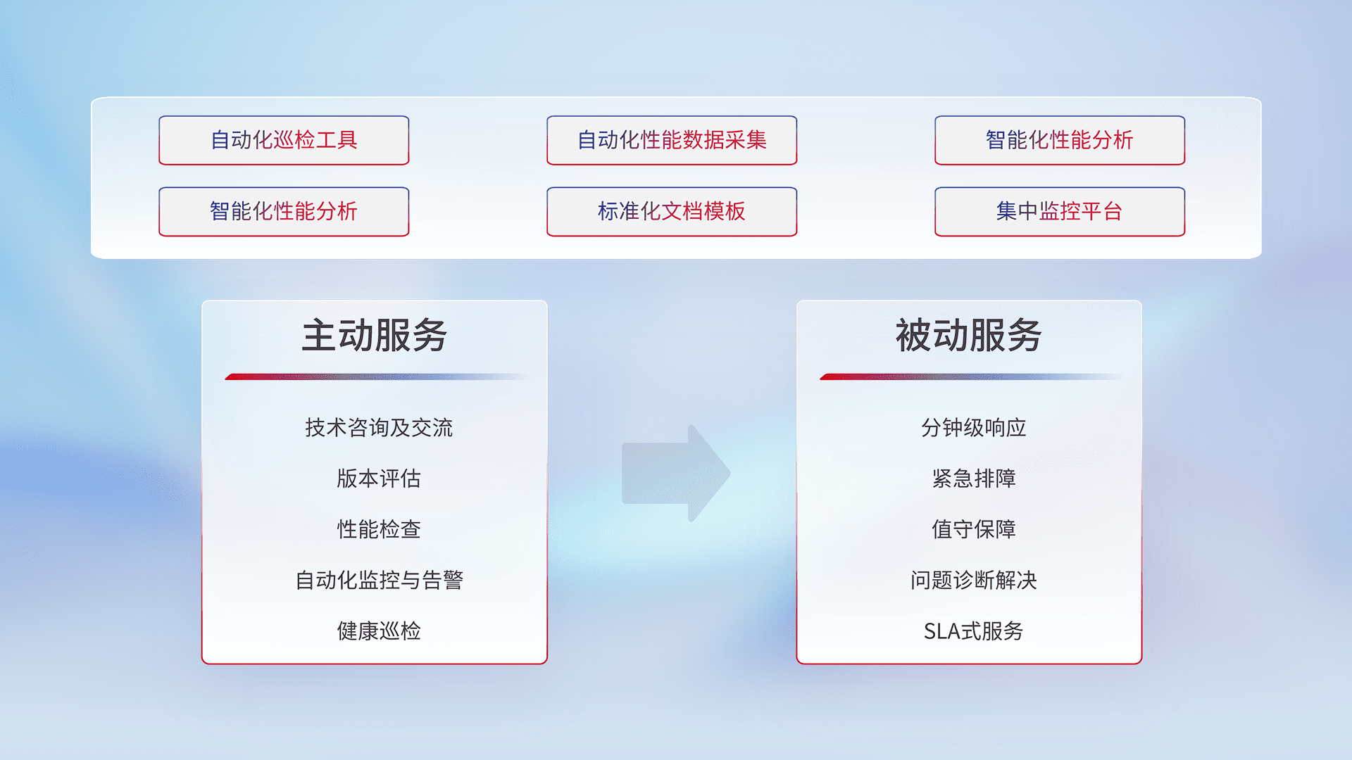 智能化工具和标准化文档,,保障服务质量,,提供主动服务(包含技术咨询、、、、版本评估、、、性能检查、、、、自动化监控与告警、、健康巡检)和被动服务包含(分钟级响应、、紧急排障、、、、值守保障、、、、问题诊断解决、、、SLA服务)。。。。